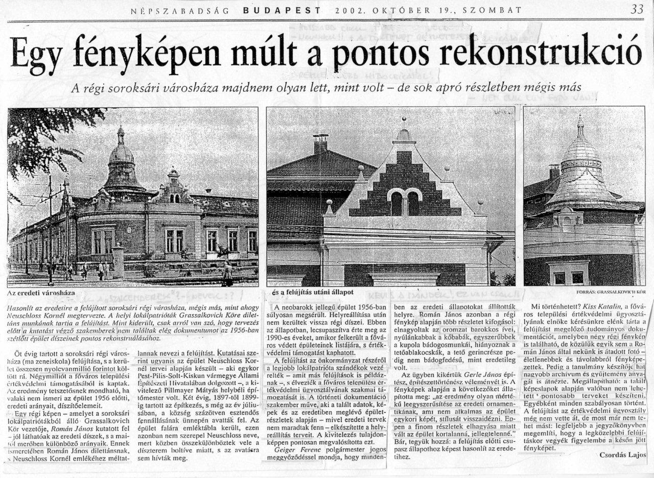 A  Grassalkovich Kör feladatának tekinti az épített örökség megbecsülését, védelmét, megmentését, ezért  fontos számunkra, hogy az épületek felújítása az eredeti állapotnak megfelelően történjen. Ennek egyik - példája a Soroksár főterén álló, 1899-ben átadott neobarokk stílusú községháza, amelyet Neuschloss Kornél, Európa Nostra díjjal kitüntetett építész tervezett. A volt községházát az önkormányzat 2002-ben felújítatta. Az építkezéskor az épület homlokzatát nem az eredeti állapotának megfelelően állították helyre.